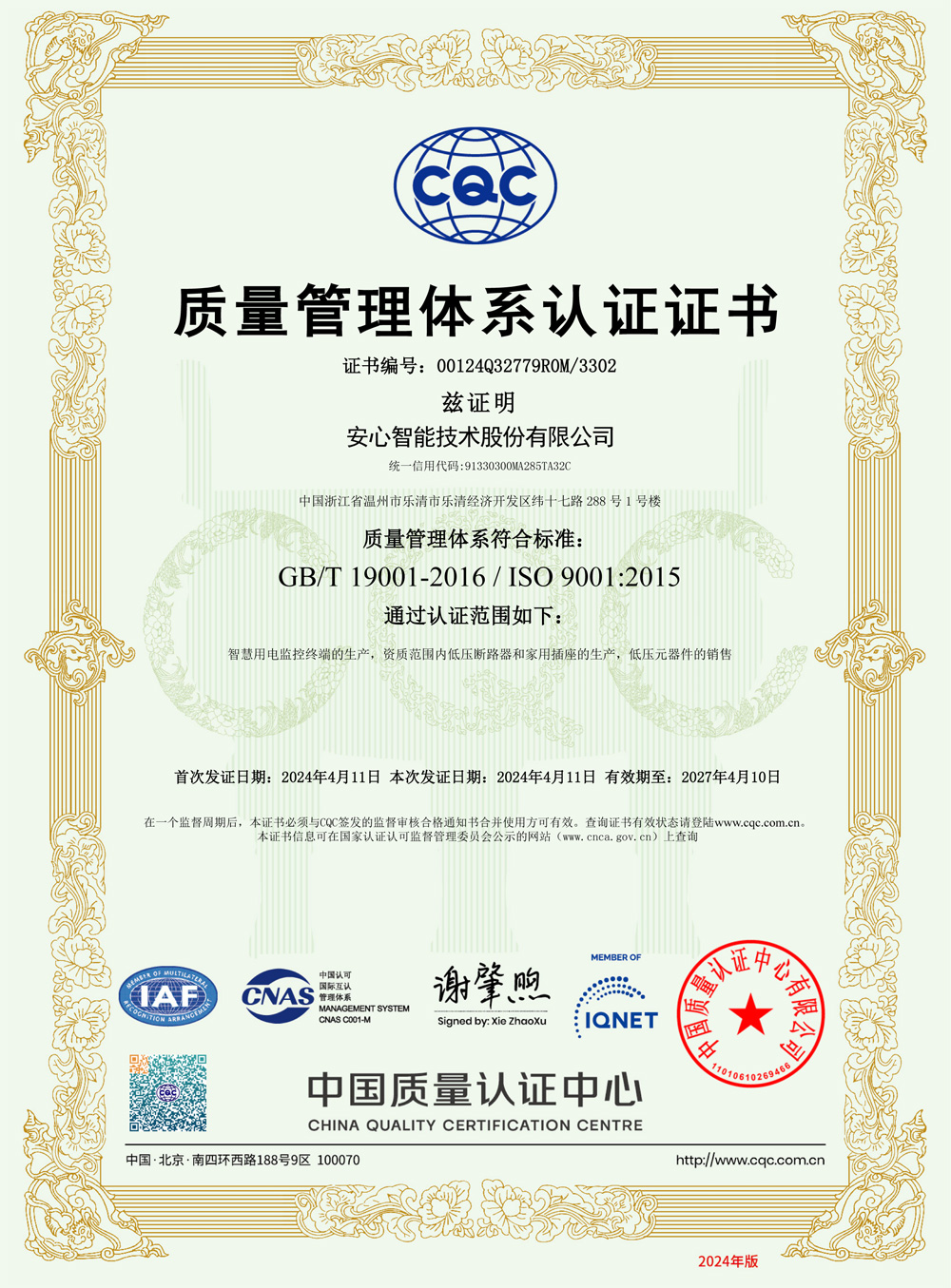 - 質量管理體系認證證書